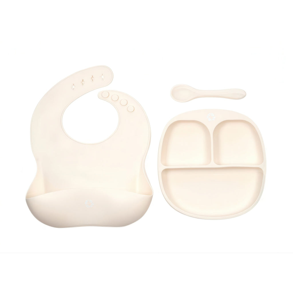 Cet ensemble 100% fait de silicone inclut : une assiette, une cuillère et une bavette.