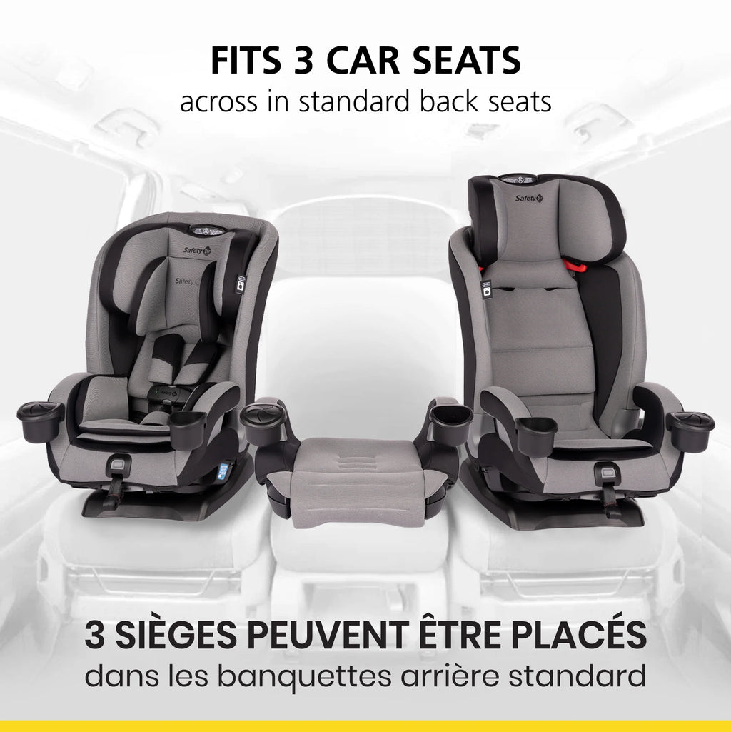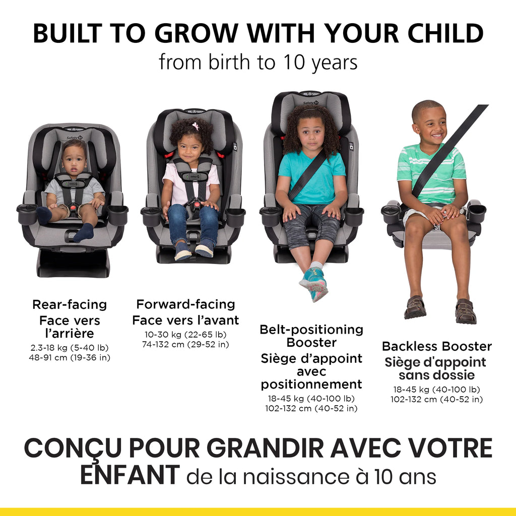 Le siège d’auto évolutif tout-en-un Safety 1st EverSlim assure la sécurité et le confort de votre enfant à chaque étape de sa croissance grâce à ses 4 modes d’utilisation : position dos à la route (5–40 lb, 19”–40”), position face à la route (22–65 lb, 29”–49”), siège d’appoint avec positionnement de la ceinture (40–100 lb, 43”–52”) et siège d’appoint sans dossier (40–100 lb, 43”–57”). Son design ultra-mince permet d’installer 3 sièges côte à côte dans la plupart des véhicules sans compromettre le confort. L’indicateur SecureTech™ sur la pince de poitrine passe du rouge au vert pour vous montrer lorsque celle-ci est bien attachée. Avec sa base inclinable à 5 positions, son appuie-tête ajustable à 10 positions d’une seule main, son siège d’appoint sans dossier facile à convertir et son tissu lavable et séchable à la machine, c’est le seul siège d’auto dont votre enfant aura besoin, de la naissance jusqu’à 10 ans.