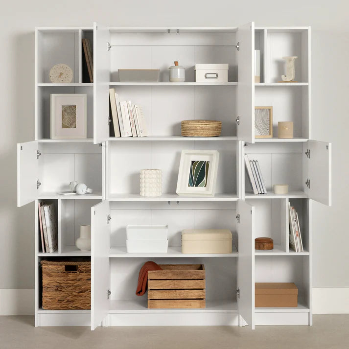 La bibliothèque principale, un peu plus large que les 2 autres, cache 2 tablettes ajustables derrière ses 4 portes sans poignées. Les 2 étagères étroites proposent quant à elles jusqu’à 6 configurations en matière de divisions et d’orientation des portes. À l’aide de l’ingénieux mécanisme à boutons-poussoirs, ouvrez les portes avec une simple pression. La découpe droite et nette de cet ensemble d’étagères créera une ambiance harmonieuse.