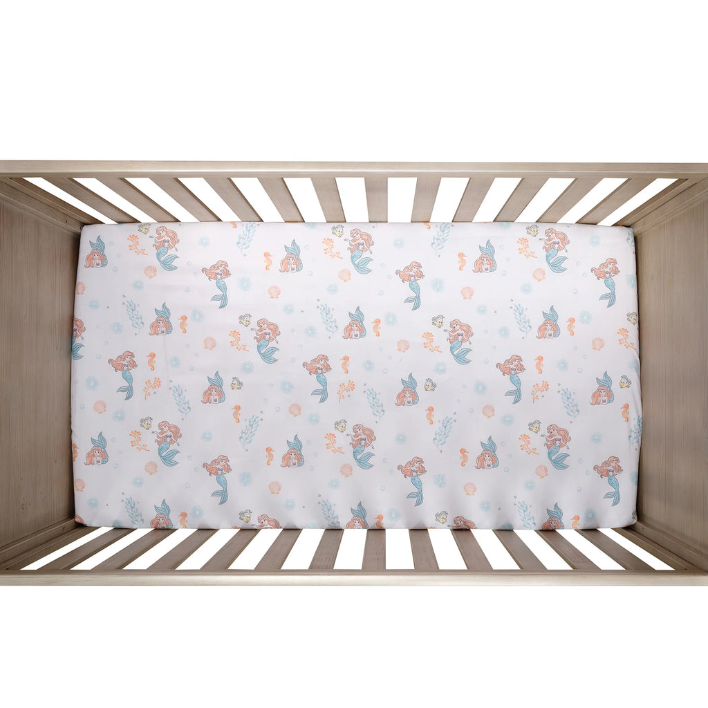 Ce drap-housse pour lit bébé Disney La Petite Sirène présente Ariel, Polochon, des hippocampes, des coquillages et des bulles sur une microfibre douce, délicate pour la peau de bébé. Entièrement élastiqué, il s'adapte parfaitement à un matelas de lit bébé standard. Ses ravissantes couleurs aquarelles, corail, écume de mer et pêche, contribuent à créer une chambre d'enfant féérique. Lavable en machine et infroissable pour un entretien facile. Ce drap-housse est idéal pour apporter une touche de magie à la chambre de votre bébé.