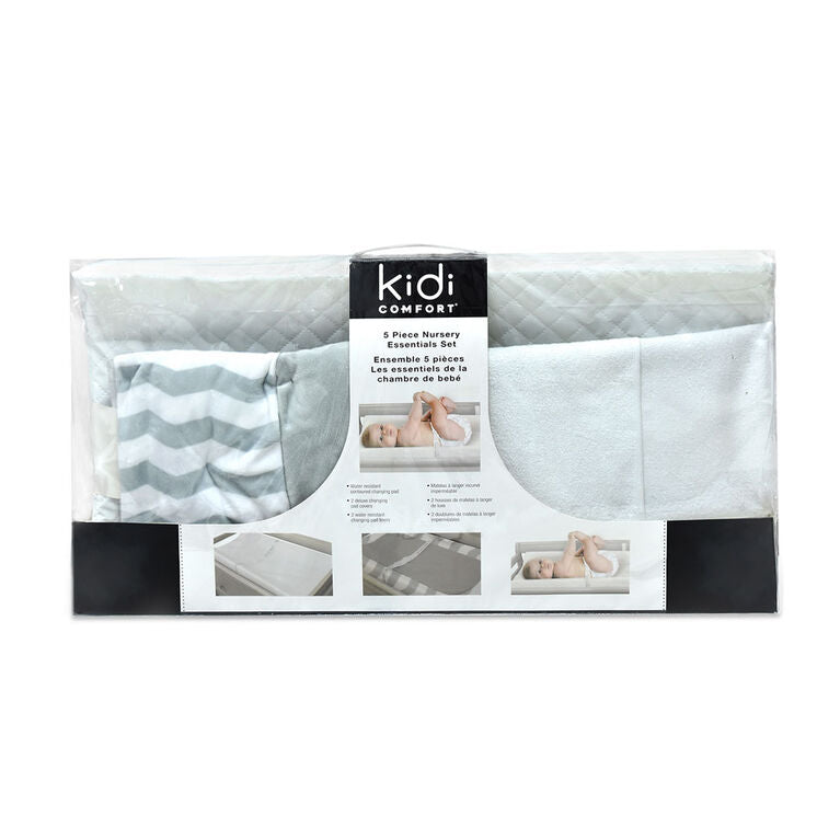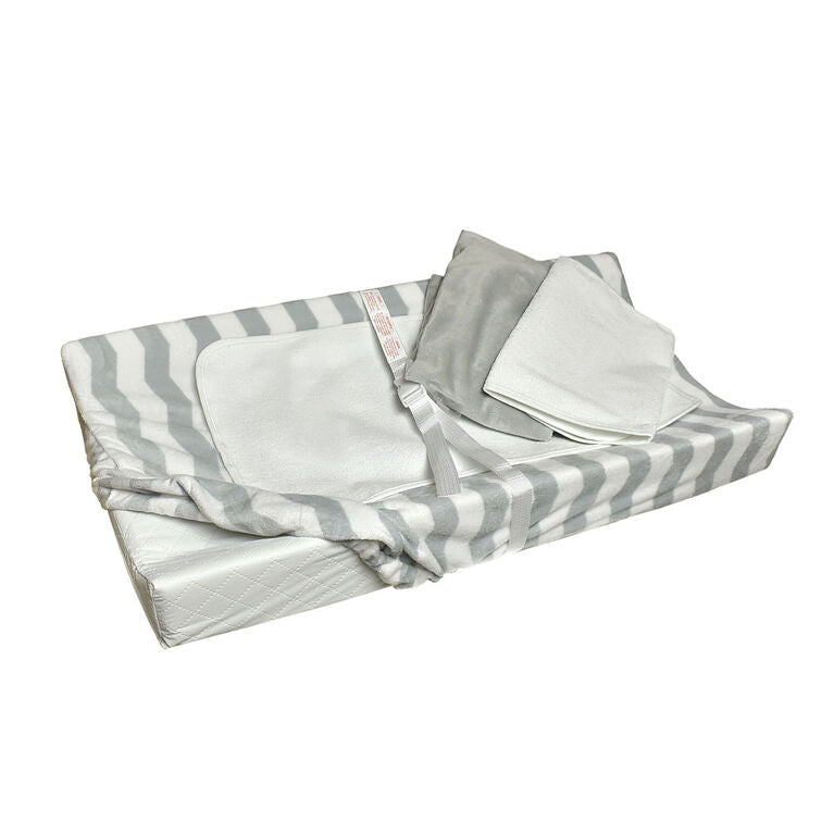 L'ensemble comprend : un matelas à langer, 2 housses de matelas à langer de luxe ( 1 uni, 1 imprimé chevron gris ) et 2 alèses de matelas à langer imperméables. - Rebords permettant une plus grande sécurité pour bébé