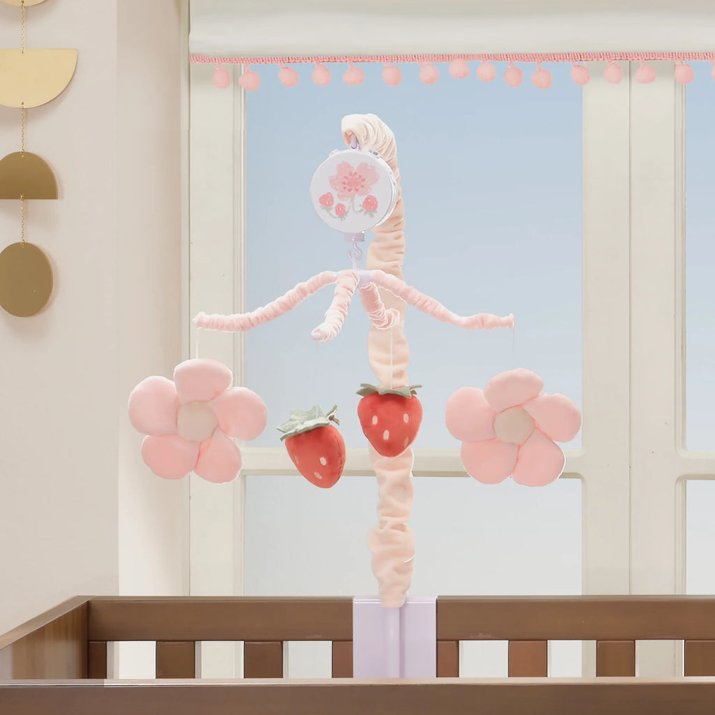 Deux fleurs roses à pétales et deux fraises colorées tournent doucement sous des manches en velours rose pâle. Les fleurs sont en joli velours rose et les fraises en velours rouge orné de pois blancs brodés et de feuilles vert poudré. Ce mobile à piles joue « Twinkle, Twinkle Little Star », « Rock-a-Bye Baby » et la Berceuse de Brahms pendant 20 minutes. Il est équipé d'un interrupteur marche/arrêt et d'un réglage du volume. Le chouchou qui recouvre le bras du mobile est en velours rose pâle doux et l'autocollant de la boîte à musique représente une fleur rose et trois petites fraises. Fonctionne avec 3 piles AAA (non fournies).