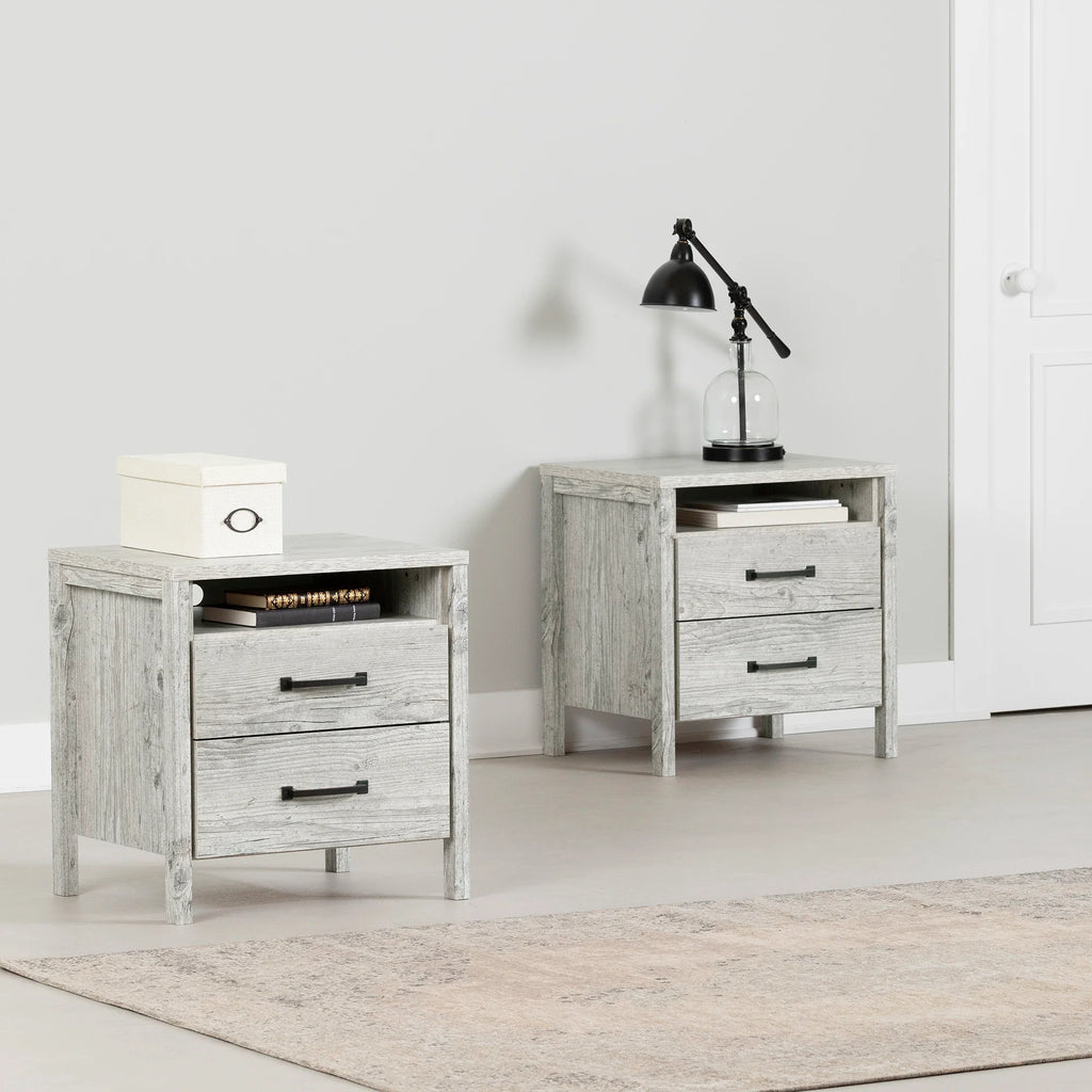 Votre chambre ne serait pas complète sans cet ensemble de 2 tables de chevet au look contemporain. Placées de part et d’autre de votre lit, elles sauront créer une ambiance harmonieuse au sein de votre espace de détente et s’agenceront à merveille avec le mobilier de la même collection. Profitez pleinement de leurs 2 larges tiroirs sur glissières en métal pour organiser efficacement vos sous-vêtements et autres accessoires. Le compartiment ouvert, quant à lui, est idéal pour que vous y déposiez votre livre en cours de lecture.